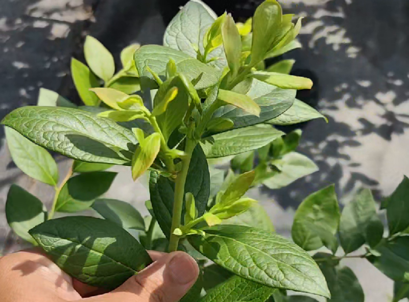 肥大浓绿油亮的绿叶数量充足,说明蓝莓制造光合养分的能力特别强,它才能根系发达枝条粗壮,这样蓝莓树上才能开花饱满多结大果。因为蓝莓生