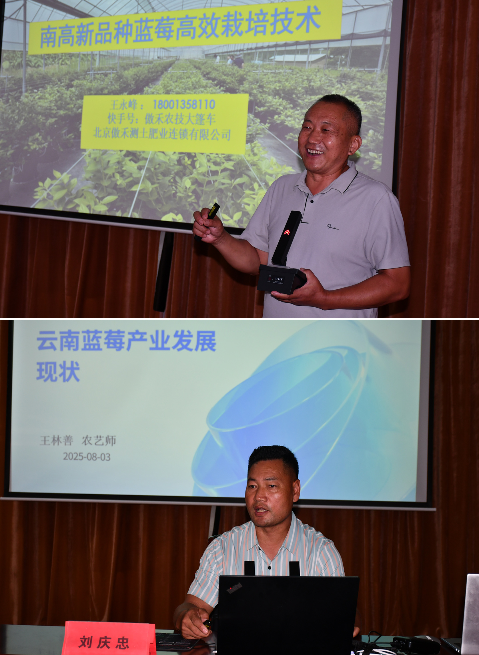 培训课堂上,果树研究所首席专家刘庆忠,蓝莓技术专家王林善、王永峰,三位专家分别以《中国蓝莓产业及发展现状》、《云南蓝莓产业发展现状》、《南高新品种蓝莓高效栽培技术》为主题,共同为大家呈上了一趟前沿实用的蓝莓高标准栽培技术知识培训盛宴。