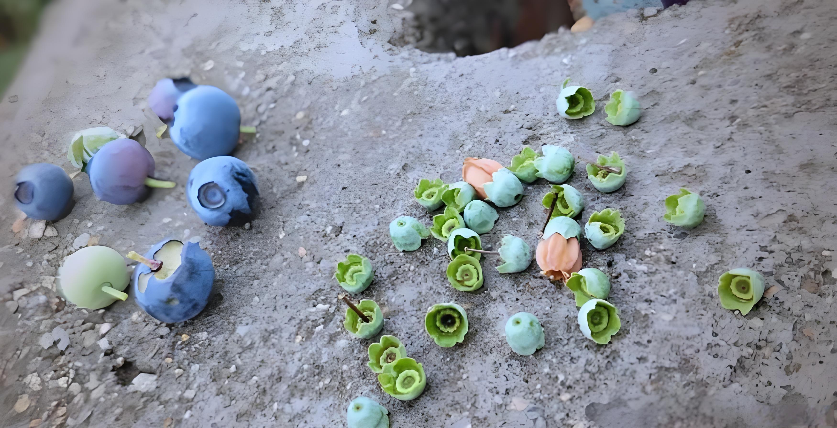 正常授粉坐果的蓝莓果实可形成 60 余粒种子,如果蓝莓花期授粉不充分、授粉不良时,果实中的种子数量就会大幅减少,种子少则果实分泌的生长素就不足,果实与枝叶争夺营养的能力就会大幅变弱变差,最终会导致果实长期营养匮乏而落果。
